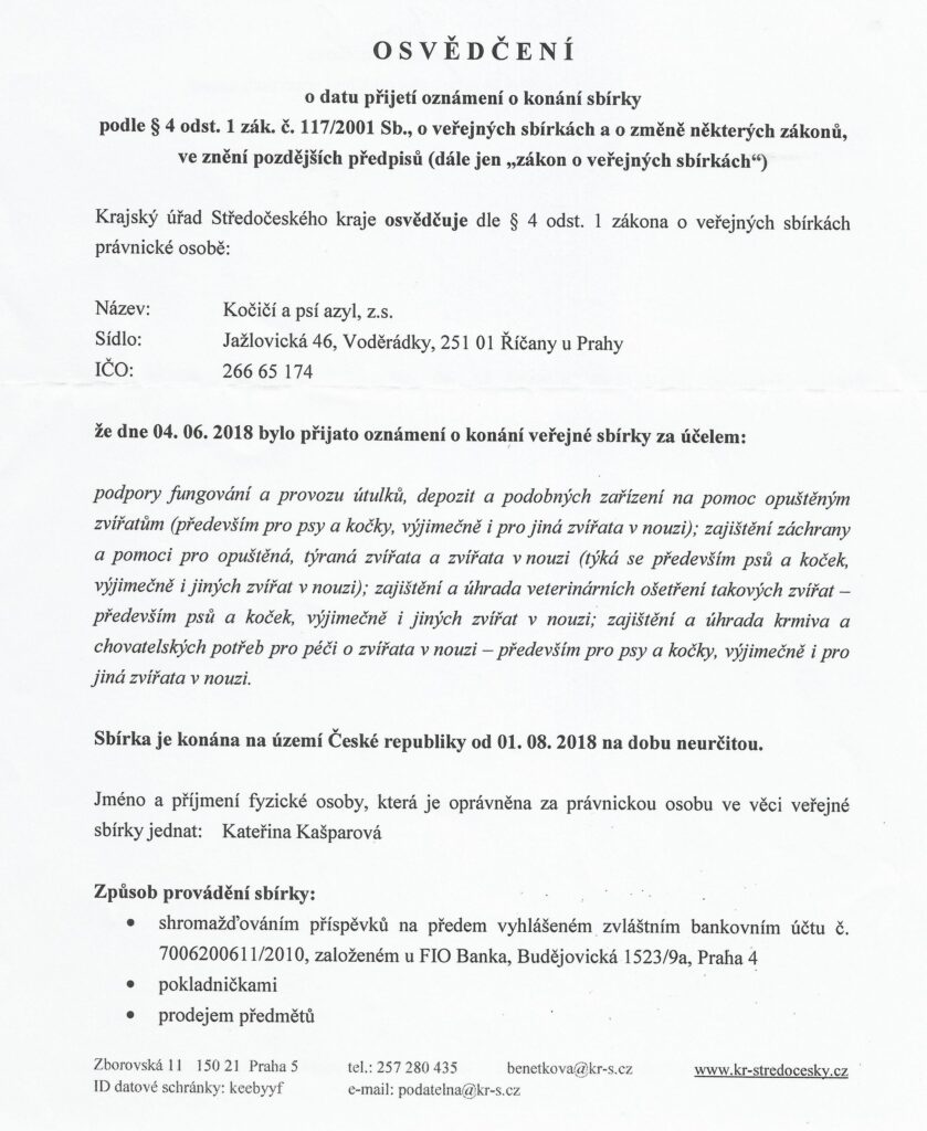 Tato Veřejná sbírka byla řádně osvědčena Krajským úřadem Středočeského kraje dne 19. 6. 2018 (na dobu neurčitou od 1. 8. 2018) pod Čj. 079063/2018/KUSK (viz fotky)